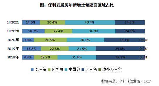 從銷售區域分布來看,2021年上半年保利發展銷售面積貢獻最大的區域為珠三角區域,占比達到32.7%,同比減少1.9各百分點;此外中西部區域銷售面積同比增長2.4各百分點至25.6%,增幅最大。