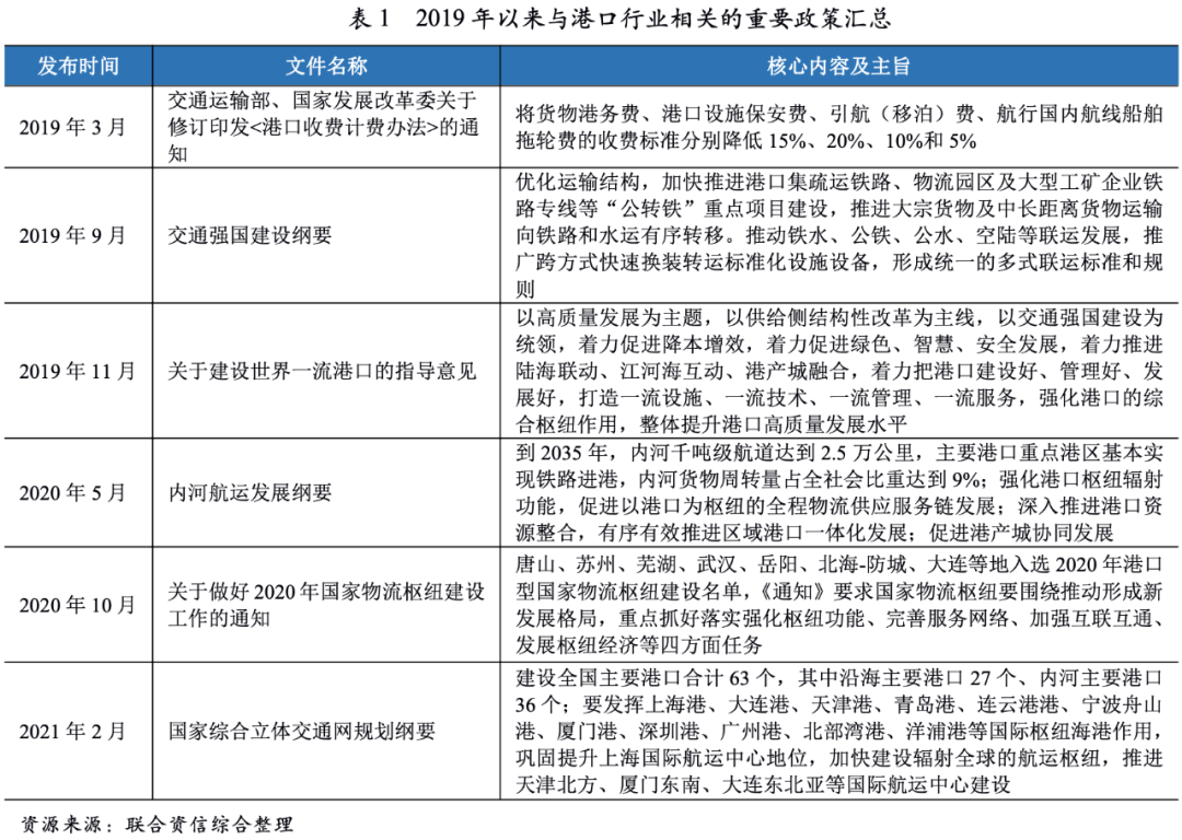 規(guī)劃建設(shè)方面,2019年9月,國(guó)務(wù)院印發(fā)《交通強(qiáng)國(guó)建設(shè)綱要》,計(jì)劃分階段將中國(guó)建成交通強(qiáng)國(guó),其中港口作為重要的交通樞紐應(yīng)優(yōu)化運(yùn)輸結(jié)構(gòu),加快推進(jìn)港口集疏運(yùn)鐵路專用線重點(diǎn)項(xiàng)目建設(shè);推動(dòng)鐵水、公鐵、公水、空陸等聯(lián)運(yùn)發(fā)展,推廣跨方式快速換裝轉(zhuǎn)運(yùn)標(biāo)準(zhǔn)化設(shè)施設(shè)備,形成統(tǒng)一的多式聯(lián)運(yùn)標(biāo)準(zhǔn)和規(guī)則。2019年11月,交通運(yùn)輸部聯(lián)合多部委印發(fā)的《關(guān)于建設(shè)世界一流港口的指導(dǎo)意見》提出,要加快世界一流港口建設(shè),著力提升綜合服務(wù)能力、加快綠色港口建設(shè)、加快智慧港口建設(shè)、加快推進(jìn)開放融合發(fā)展、加快平安港口建設(shè)及推進(jìn)治理體系現(xiàn)代化,著力推進(jìn)陸海聯(lián)動(dòng)、江河?;?dòng)、港產(chǎn)城融合。2020年5月,交通運(yùn)輸部印發(fā)了《內(nèi)河航運(yùn)發(fā)展綱要》,提出到2035年主要內(nèi)河港口重點(diǎn)港區(qū)基本實(shí)現(xiàn)鐵路進(jìn)港,內(nèi)河貨物周轉(zhuǎn)量占全社會(huì)比重達(dá)到9%;同時(shí)強(qiáng)化港口樞紐輻射功能,促進(jìn)以港口為樞紐的全程物流供應(yīng)服務(wù)鏈發(fā)展,深入推進(jìn)港口資源整合,有序有效推進(jìn)區(qū)域港口一體化發(fā)展,促進(jìn)港產(chǎn)城協(xié)同發(fā)展。2021年2月,中共中央、國(guó)務(wù)院印發(fā)了《國(guó)家綜合立體交通網(wǎng)規(guī)劃綱要》,提出建設(shè)全國(guó)主要港口合計(jì)63個(gè),其中沿海主要港口27個(gè)、內(nèi)河主要港口36個(gè);要發(fā)揮上海港、大連港、天津港、青島港、連云港港、寧波舟山港、廈門港、深圳港、廣州港、北部灣港、洋浦港等國(guó)際樞紐海港作用,加快建設(shè)輻射全球的航運(yùn)樞紐。
