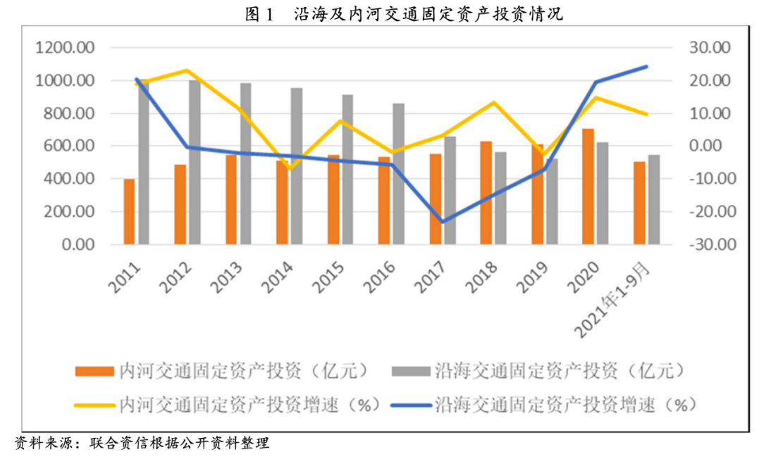 港口投資方面,中國(guó)沿海港口已處于結(jié)構(gòu)性產(chǎn)能過剩階段,沿海交通固定資產(chǎn)投資規(guī)模自2012年以來持續(xù)下降,2019年下降至523.81億元。內(nèi)河航運(yùn)具有運(yùn)能大、占地少、能耗低、污染小的優(yōu)勢(shì),近年來,中國(guó)積極推進(jìn)內(nèi)河航運(yùn)發(fā)展,內(nèi)河交通固定資產(chǎn)投資規(guī)模呈現(xiàn)波動(dòng)增長(zhǎng)態(tài)勢(shì),至2020年已連續(xù)三年超過沿海交通固定資產(chǎn)投資額。