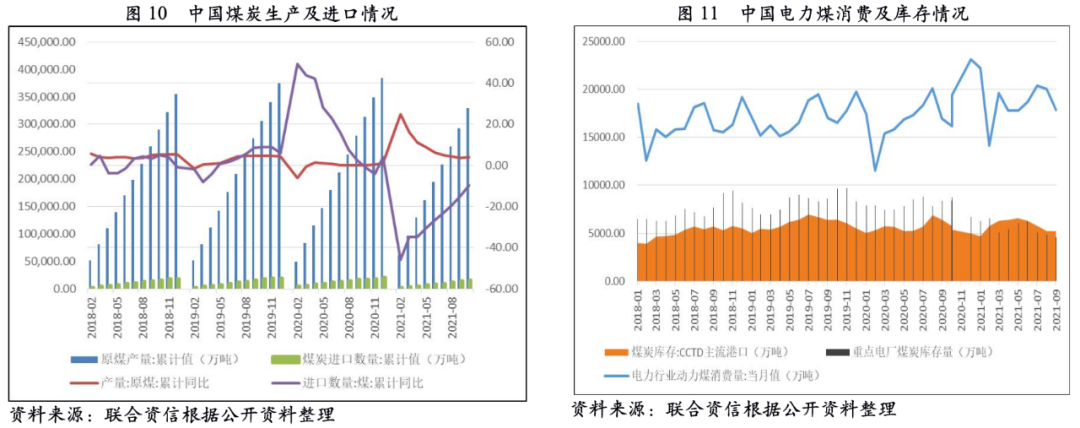 煤炭行業(yè)的下游需求主要集中在電力(約占54%)、鋼鐵(約占18%)和建材行業(yè)(約占10%)。2021年我國(guó)制造業(yè)及出口景氣度較高,對(duì)電力的消耗處于高位,2021年1—9月,全國(guó)火力發(fā)電量4.33萬(wàn)億千瓦時(shí),同比增長(zhǎng)12.94%,帶動(dòng)電力行業(yè)動(dòng)力煤消耗量維持在相對(duì)較高水平。2021年1—10月,全國(guó)原煤產(chǎn)量32.97億噸,同比增長(zhǎng)4.00%;同期,全國(guó)煤炭進(jìn)口量1.61億噸,同比下降9.82%,主要受中澳關(guān)系緊張減少進(jìn)口所致。受煤炭需求旺盛影響,CCTD主流港口煤炭庫(kù)存及重點(diǎn)電廠煤炭庫(kù)存目前均處于低位,存在較大補(bǔ)庫(kù)需求。此外,2019年9月28日,連接內(nèi)蒙古浩勒?qǐng)?bào)吉與江西吉安的浩吉鐵路全線通車運(yùn)營(yíng),浩吉鐵路年規(guī)劃煤炭運(yùn)力為2億噸,是中國(guó)“北煤南運(yùn)”戰(zhàn)略運(yùn)輸通道,其開通對(duì)煤炭海運(yùn)及港口煤炭吞吐量造成較大分流。