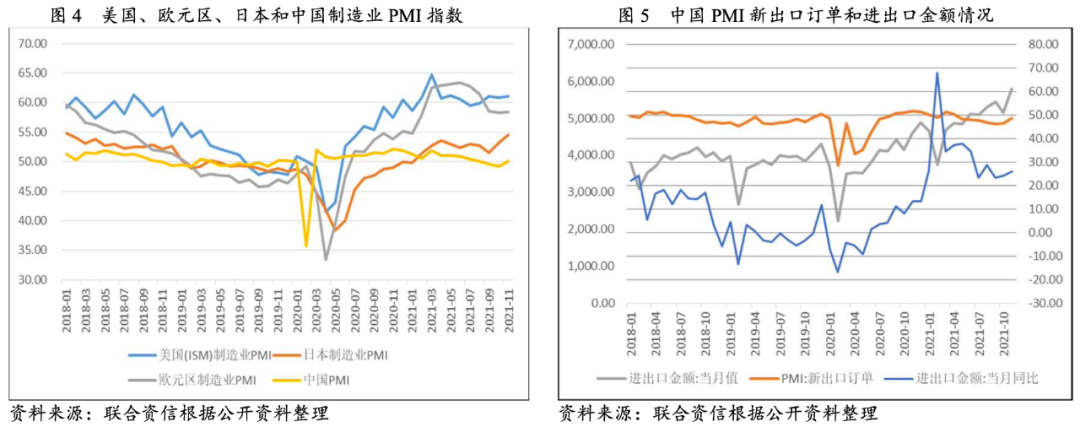 從全球經(jīng)濟(jì)發(fā)展角度看,2020年爆發(fā)的新冠肺炎疫情對(duì)全球經(jīng)濟(jì)造成劇烈沖擊,中國(guó)、美國(guó)、日本和歐元區(qū)制造業(yè)PMI指數(shù)分別于2020年2~5月創(chuàng)下了35.70%、41.50%、33.40%和38.40%的低點(diǎn)。隨著疫情防控的常態(tài)化,企業(yè)得以逐步復(fù)工復(fù)產(chǎn),美國(guó)和歐洲經(jīng)濟(jì)體普遍采取較大力度的財(cái)政、貨幣刺激方案,美國(guó)和歐元區(qū)制造業(yè)PMI從低點(diǎn)持續(xù)上升,并分別于2021年3月和6月創(chuàng)下64.70%和63.40%的高點(diǎn),之后開始逐步回落。日本疫情控制相對(duì)較好,經(jīng)濟(jì)刺激手段也相對(duì)克制,制造業(yè)PMI指數(shù)走勢(shì)與美歐基本趨同但波動(dòng)幅度明顯較小,10月份以來受西方節(jié)前備貨需求影響明顯回升。中國(guó)疫情于2020年3月基本得到控制,之后制造業(yè)PMI指數(shù)一直在50.60%~52.10%之間小幅波動(dòng),直到2021年3月之后開始回落,9月份開始跌破50%的榮枯臨界點(diǎn),11月受西方節(jié)前備貨需求影響略有回升,國(guó)內(nèi)經(jīng)濟(jì)下行壓力加大。疫情對(duì)全球經(jīng)濟(jì)的影響已明顯弱化,且受制于全球通脹壓力不斷積累,各國(guó)開始逐步退出寬松政策,預(yù)計(jì)未來全球經(jīng)濟(jì)增速將有所放緩。國(guó)際貨幣基金組織最新預(yù)測(cè)2021年全球經(jīng)濟(jì)將增長(zhǎng)5.8%,2022年將增長(zhǎng)4.9%,2022年增速較2021年有所下降,但仍高于疫情前的平均水平(2012—2019年平均增速為3.42%)。