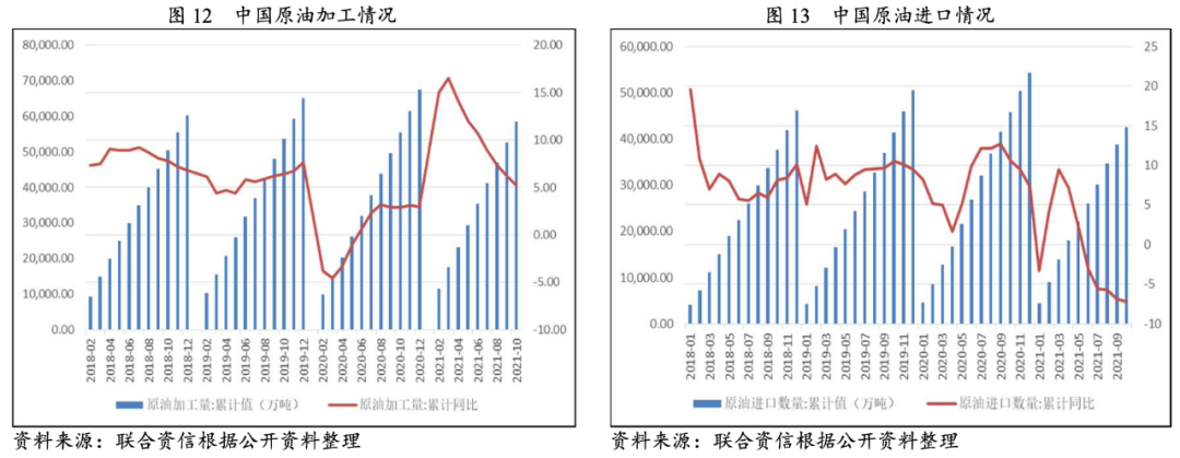 2021年1—10月,全國(guó)原油加工量5.85億噸,同比增長(zhǎng)5.20%,增速低于2019年水平,主要系疫情抑制了客運(yùn)周轉(zhuǎn)導(dǎo)致燃油消耗需求不足。中國(guó)對(duì)原油需求的缺口較大導(dǎo)致對(duì)進(jìn)口嚴(yán)重依賴,2021年1—10月,全國(guó)原油進(jìn)口量4.25億噸,同比下降7.2%,受需求不足以及國(guó)際原油價(jià)格較高影響已處于負(fù)增長(zhǎng)狀態(tài)。鑒于新冠疫情的持續(xù)反復(fù)及疫情防控的常態(tài)化,預(yù)計(jì)未來短期內(nèi)港口原油吞吐量仍將面臨較大壓力。
