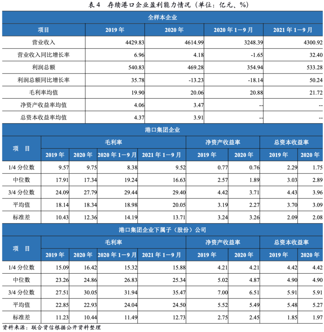 值得關(guān)注的是,港口企業(yè)盈利能力分化較為明顯,處于后1/4分位的港口集團(tuán)企業(yè)盈利能力指標(biāo)明顯較弱,其中5家企業(yè)2020年及2021年前三季度歸屬母公司凈利潤(rùn)持續(xù)為負(fù)。