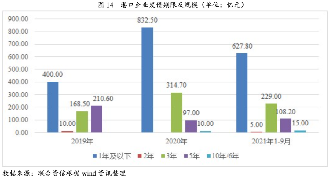 從發(fā)行期限看,2020年港口企業(yè)新發(fā)債券期限以1年期及以下、3年期和5年期為主,發(fā)行規(guī)模占比分別66.38%、25.09%和7.73%。2021年前三季度,港口企業(yè)1年及以下債券發(fā)行規(guī)模占比最高,為63.74%,較上年下降2.91個(gè)百分點(diǎn);3年期發(fā)行規(guī)模占比為23.25%,較上年變化不大;5年期債券發(fā)行規(guī)模占比為10.98%,較上年上升3.25個(gè)百分點(diǎn)。