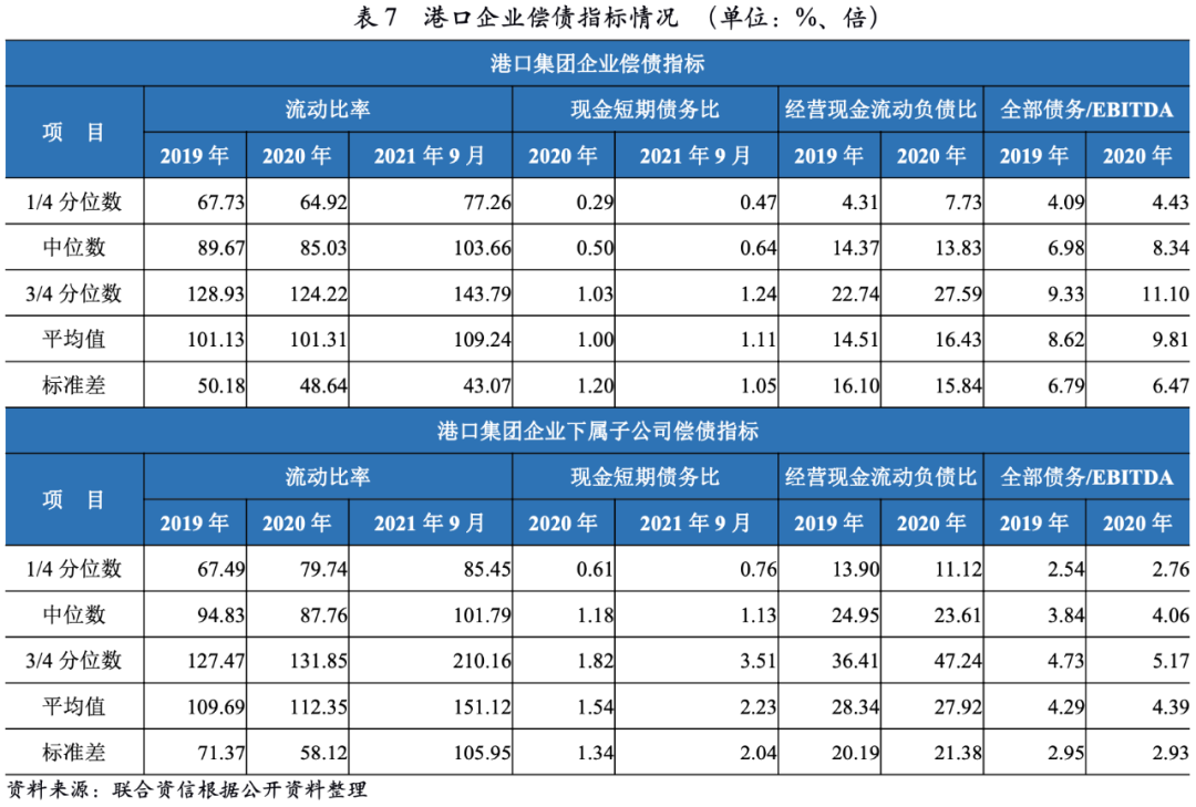 值得關(guān)注的是,港口集團(tuán)企業(yè)負(fù)債水平分化較為明顯,處于后1/4分位的港口集團(tuán)企業(yè)負(fù)債水平明顯偏高,其中6家企業(yè)2021年9月底的全部債務(wù)資本化比率超過60%。