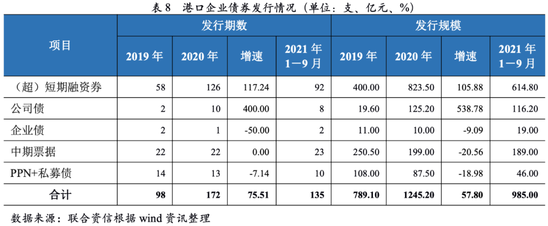 從發(fā)行品種看,2019-2020年和2021年前三季度,港口企業(yè)發(fā)行的(超)短期融資券規(guī)模最大,占比分別為50.69%、66.13%和62.42%,主要用于補(bǔ)充流動(dòng)資金需求;中期票據(jù)規(guī)模次之,占比分別為31.75%、15.98%和19.19%;其他品種發(fā)行規(guī)模較小。
