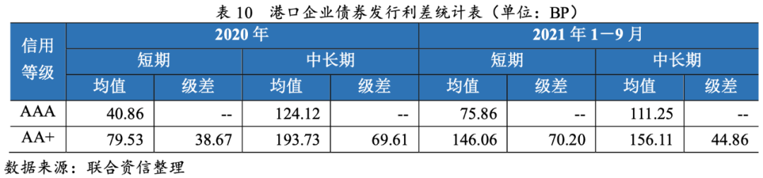 2021年以來,港口企業(yè)短期發(fā)行利差整體呈波動(dòng)上升趨勢(shì),長(zhǎng)期發(fā)行利差相對(duì)穩(wěn)定,AA+級(jí)短期級(jí)差走闊,AA+級(jí)中長(zhǎng)期極差有所收縮。