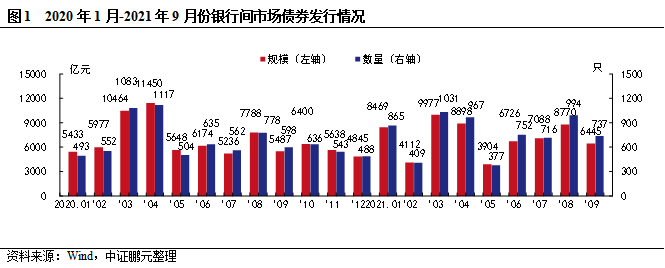 2021年9月,我國銀行間市場共發行信用債券737只,發行規模6,445.12億元,環比分別下降26.74%和27.33%,同比分別上升23.24%和17.46%。綜合1-9月來看,銀行間市場發行信用債券6,857只,發行規模為64,519.03億元,比去年同期發行數量和規模分別上升8.50%和1.37%。
