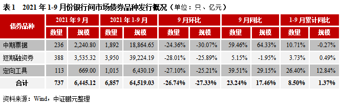9月發行的中期票據中包括特殊期限含權中期票據62只,發行規模498.90億元。9月發行的短期融資券中包括超短融(SCP)338只,發行規模3,111.02億元。