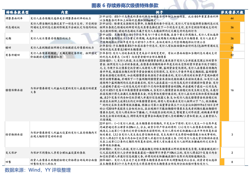 目前現存券商次級債多為可用于補充附屬凈資本的長期次級債,YY評級在2-3以及5-6+的頭部和腰部券商為發行主力,發行人資質整體較優。相對于銀行二級資本來說,券商次級債條款設置較為友好,目前存續債均未附減記條款且永續次級債尚無延期情況出現。收益率分級別來看,頭部和尾部近年分化加大,利差已擴大至200bp。
