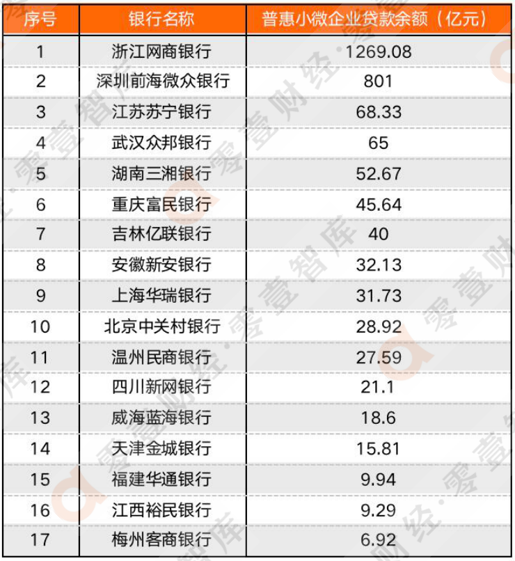 3、 浙江網商銀行和吉林億聯銀行數據來源于新京報、溫州民商銀行根據年報中“普惠小微貸款余額占比”測算所得。4、僅限各家銀行表內數據不含聯合貸。