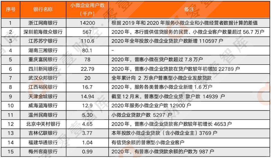 根據各銀行2020年年報的披露情況,民營銀行小微企業用戶數披露并不完整,共有14家披露相關數據,所披露的口徑也不盡相同,部分銀行披露的為整體小微企業用戶數,部分銀行所披露的為普惠小微客戶數,數據可比性較差。具體數據如下,可作為參考。