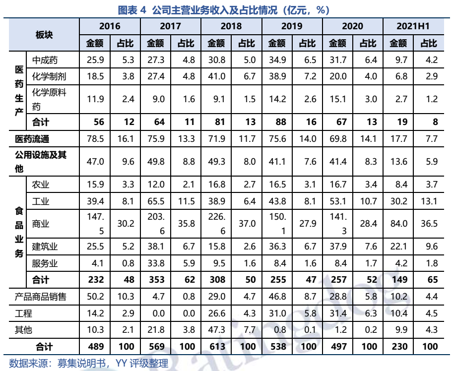 公司主營業(yè)務(wù)包括醫(yī)藥生產(chǎn)及醫(yī)藥流通板塊(已出表)、食品業(yè)務(wù)板塊、公共設(shè)施及其他等,核心子公司包括天津醫(yī)藥、天津食品、津聯(lián)集團等。近年來收入規(guī)模持續(xù)收縮,目前子公司中,天津醫(yī)藥和中環(huán)集團已完成混改,天津醫(yī)藥出表,對公司主營業(yè)務(wù)合并層面影響較大,未來可比性弱。