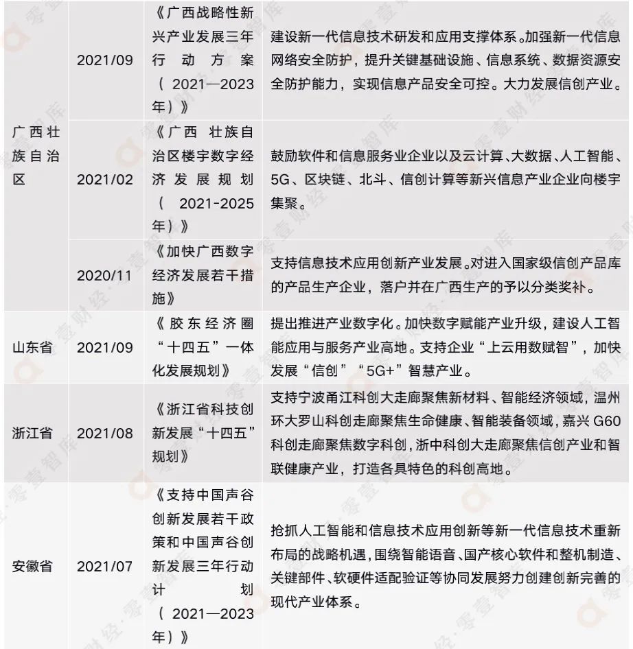 隨著信創發展到了一定階段,各地政府對當地信創產業發展要求以及路線不可避免地發生了改變。根據各地方政府近兩年來發布的最新的信創相關政策文件可以看出,以浙江省、北京市、四川省為代表的省級行政區因地制宜,明確提出在當地建設信創基地,依托當地企業、科研院所等優勢,在當地建立信創生態,避免在信創發展中后期可能存在的受制于人的情況。以天津市、山東省、安徽省為代表的省級行政區則加速發展信創硬軟件,推進信創、人工智能、5G+等多熱門領域協同發展發展,力求在信息技術領域全方面、立體化發展。