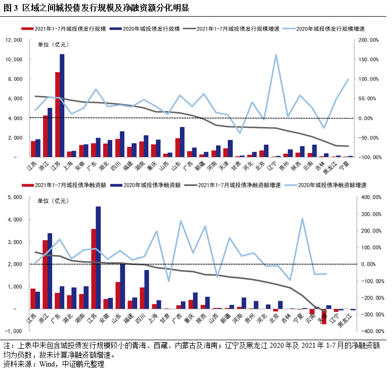 2021年1-7月全國城投債發行規模增速有所下降,凈融資額較上年同期有所下降,區域之間城投債發行及凈融資規模分化加劇,資金向浙江、江蘇、廣東經濟發展水平高及江西、湖北、安徽中部省份聚集,黑龍江、遼寧、天津、吉林、云南等省市城投債再融資受阻,區域之間利差走勢繼續分化,發債規模最大的江蘇的各地級市凈融資額趨勢也有差異,鎮江市、淮安市凈融資規模下降較多。