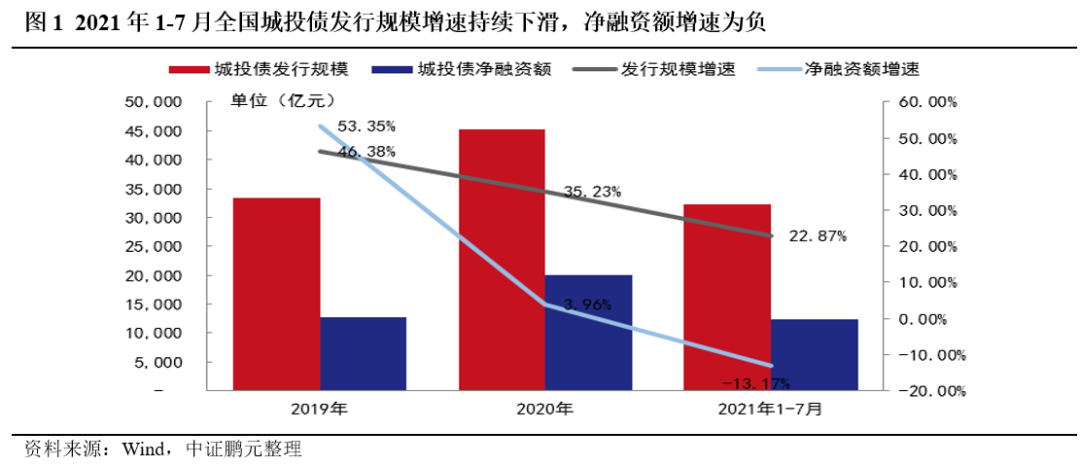 2021年1-7月,全國城投債發行規模仍保持增長,但增速較2019及2020年有所下降,且受到期規模增加及發行審核趨緊的影響,凈融資額較上年同期下降13.17%。