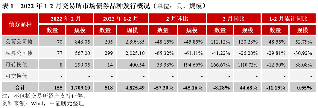 2022年2月份,我國(guó)交易所市場(chǎng)共發(fā)行信用債券155只,發(fā)行規(guī)模1,709.10億元。交易所信用債券發(fā)行環(huán)比分別下降57%和45%,同比分別下降8%和增長(zhǎng)45%。2月份,公募公司債發(fā)行70只,發(fā)行規(guī)模843.05億元,環(huán)比分別下降48%和46%,同比分別增長(zhǎng)112%和120%;私募公司債發(fā)行77只,發(fā)行規(guī)模567.00億元,環(huán)比分別下降65%和61%,同比分別下降41%和26%。可轉(zhuǎn)債發(fā)行8只,發(fā)行規(guī)模299.05億元,環(huán)比分別增長(zhǎng)33%和195%,同比分別增長(zhǎng)167%和11倍。綜合1-2月來(lái)看,交易所債券市場(chǎng)共發(fā)行信用債券518只,發(fā)行規(guī)模4,825.49億元,比2021年同期相比發(fā)行數(shù)量和規(guī)模分別下降11%和增長(zhǎng)1%。其中,公募公司債發(fā)行規(guī)模累計(jì)同比增幅為53%,私募公司債發(fā)行規(guī)模累計(jì)同比下降31%。1-2月份,無(wú)可交換債券發(fā)行。