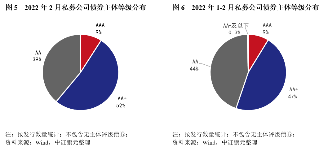 綜合2022年1-2月份的情況來(lái)看,交易所公司債券主體級(jí)別仍以中高等級(jí)為主,AAA級(jí)、AA+級(jí)、AA級(jí)主體評(píng)級(jí)占比分別為37%、35%、27%。其中,公募公司債AAA級(jí)、AA+級(jí)、AA級(jí)及AA-及以下主體評(píng)級(jí)占比分別為77%、20%、3%,0.5%;私募公司債AAA級(jí)、AA+級(jí)、AA級(jí)及AA-及以下主體評(píng)級(jí)占比分別為9%、47%、44%、0.3%。