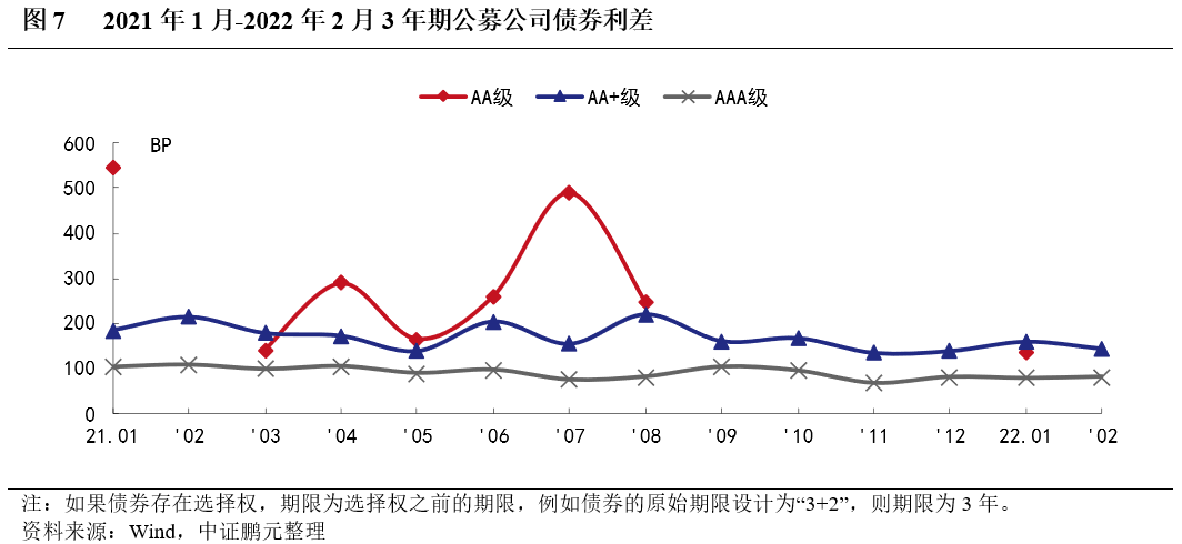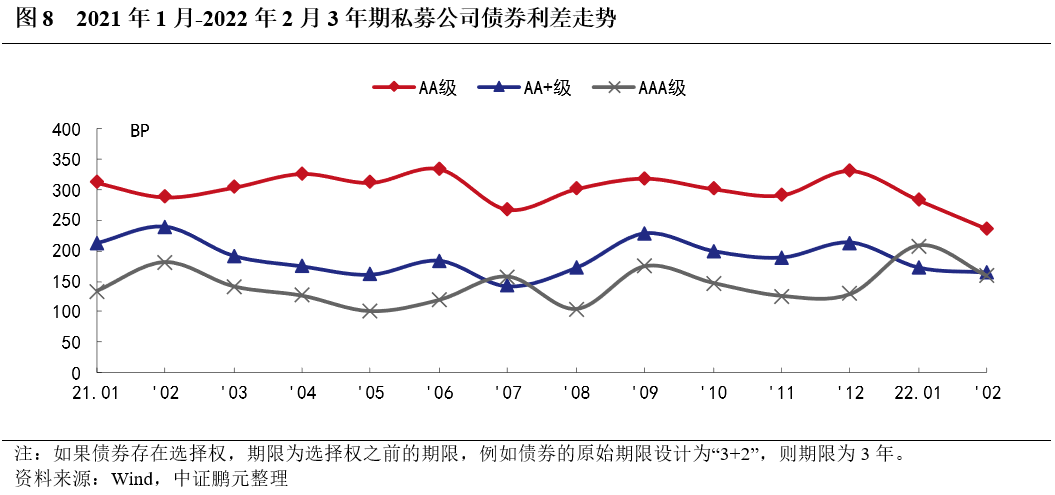 就發(fā)行利率而言,2022年2月份交易所公司債券的最高利率為8.0%,較上月最高利率下降50BP;最低發(fā)行利率為2.15%,較上月最低利率下降15BP。與1月份相比,公募公司債券方面,AAA級(jí)平均發(fā)行利率上行9BP、利差擴(kuò)大11BP,AA+級(jí)平均發(fā)行利率下行33BP,利差收窄31BP;私募公司債券方面,AAA級(jí)平均發(fā)行利率上行27BP、利差擴(kuò)大28BP,AA+級(jí)平均發(fā)行利率下行30BP,利差收窄25BP,AA級(jí)平均發(fā)行利率下行65BP、利差收窄59BP。AA+和AAA級(jí)私募公司債的發(fā)行利率和發(fā)行利差仍倒掛,但差值較上月收窄。