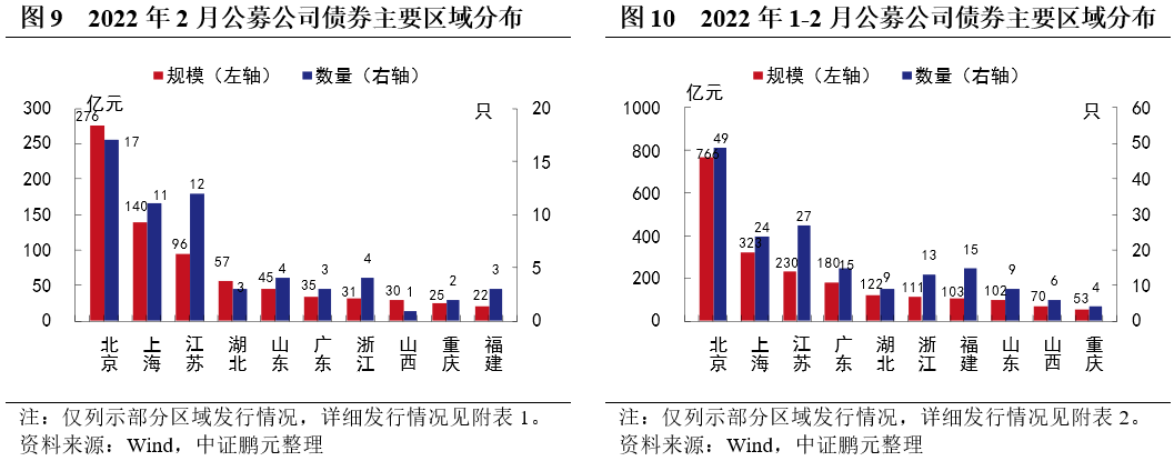 區(qū)域分布方面,2月份公募公司債券發(fā)行人以北京、上海、江蘇地區(qū)為主,私募公司債主要分布在江蘇、浙江、安徽地區(qū)。