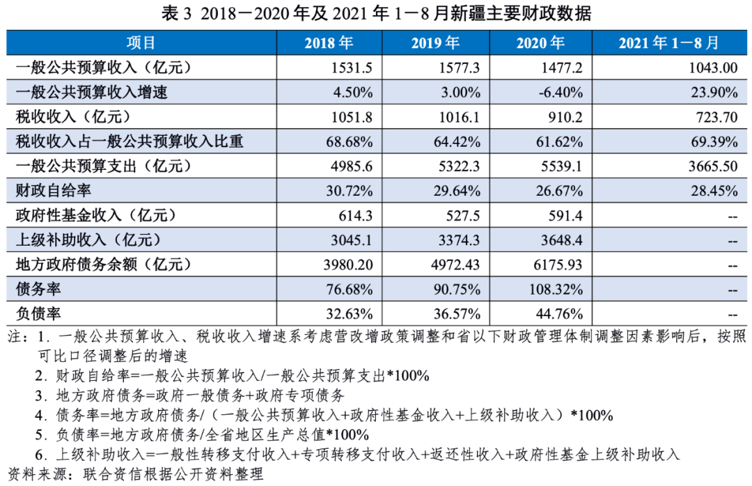 新疆一般公共預(yù)算收入居于全國中下游水平,財政自給能力較弱,政府性基金收入占新疆綜合財力的比重不高,地方可用財力對上級補助的依賴程度高。新疆政府債務(wù)余額在全國排22位,負債率和債務(wù)率在全國排名中下游水平,政府債務(wù)負擔處于可控范圍。