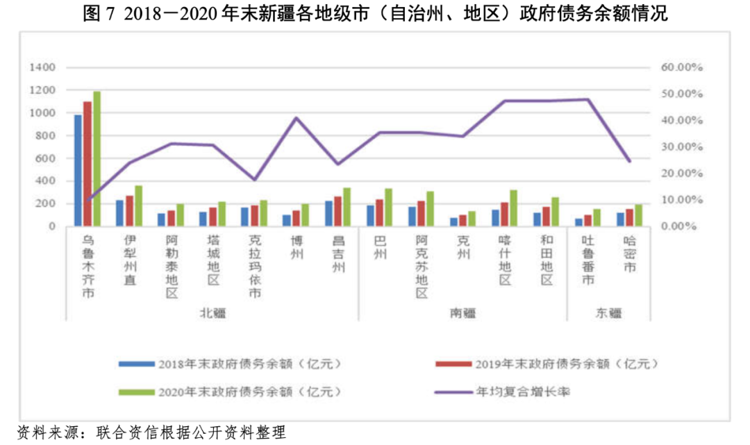 從政府債務(wù)層面看,烏魯木齊市的政府債務(wù)余額顯著高于其他地區(qū)。截至2020年末,烏魯木齊市債務(wù)余額超過千億元,占全省債務(wù)余額的19.25%[3]。此外,伊犁州直、昌吉州、巴州、阿克蘇地區(qū)、喀什地區(qū)債務(wù)余額也相對較高,超過300億元。2018-2020年末,新疆各地級市(自治州、地區(qū))政府債務(wù)余額均持續(xù)增長,除烏魯木齊市外,其余地級市(自治州、地區(qū))年均復合增長率均超過17%。