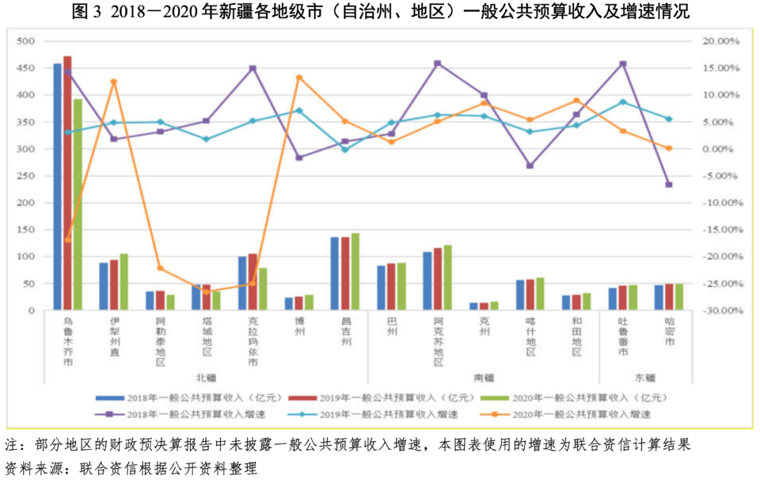 新疆各地級市(自治州、地區(qū))一般公共預(yù)算收入規(guī)模差異較大。2018-2020年,北疆的烏魯木齊市、伊犁州(伊犁州直、阿勒泰地區(qū)和塔城地區(qū)合計)和昌吉州的一般公共預(yù)算收入明顯高于其余地級市(自治州、地區(qū)),均超過100億元。此外,位于南疆的阿克蘇地區(qū)一般公共預(yù)算收入也超過100億元,克拉瑪依市、巴州和喀什地區(qū)一般公共預(yù)算收入位于50~100億元之間,其余地級市(自治州、地區(qū))的一般公共預(yù)算收入均不足100億元。