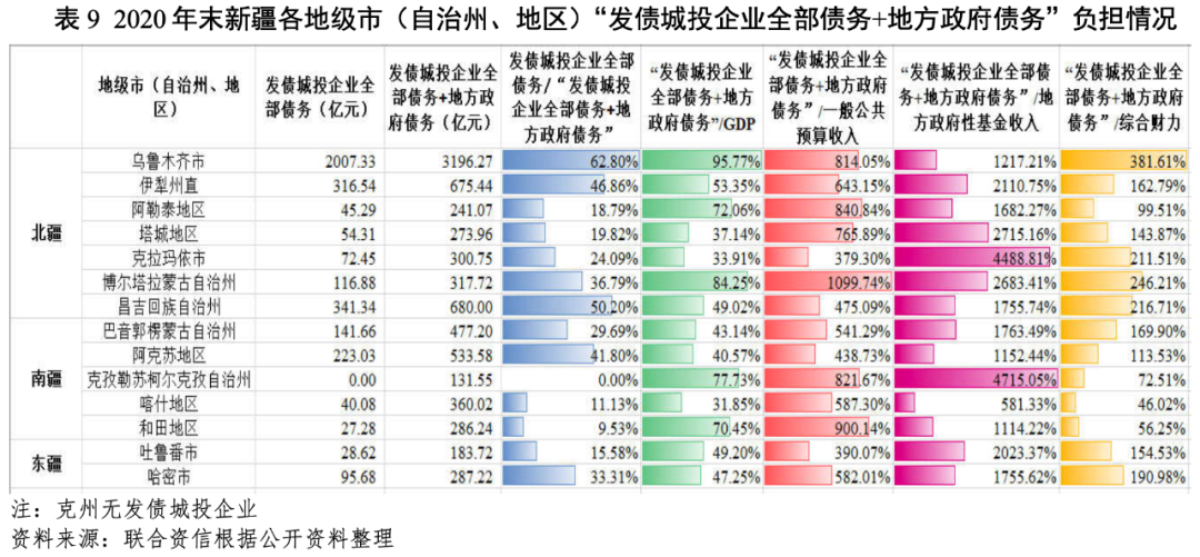 從2020年末發(fā)債城投企業(yè)全部債務(wù)與“發(fā)債城投企業(yè)全部債務(wù)+地方政府債務(wù)”的比值看,除烏魯木齊市、伊犁州直、巴州、博州和阿克蘇地區(qū)外,其余地級市發(fā)債城投企業(yè)全部債務(wù)占“發(fā)債城投企業(yè)全部債務(wù)+地方政府債務(wù)”的比重均未超過25%。