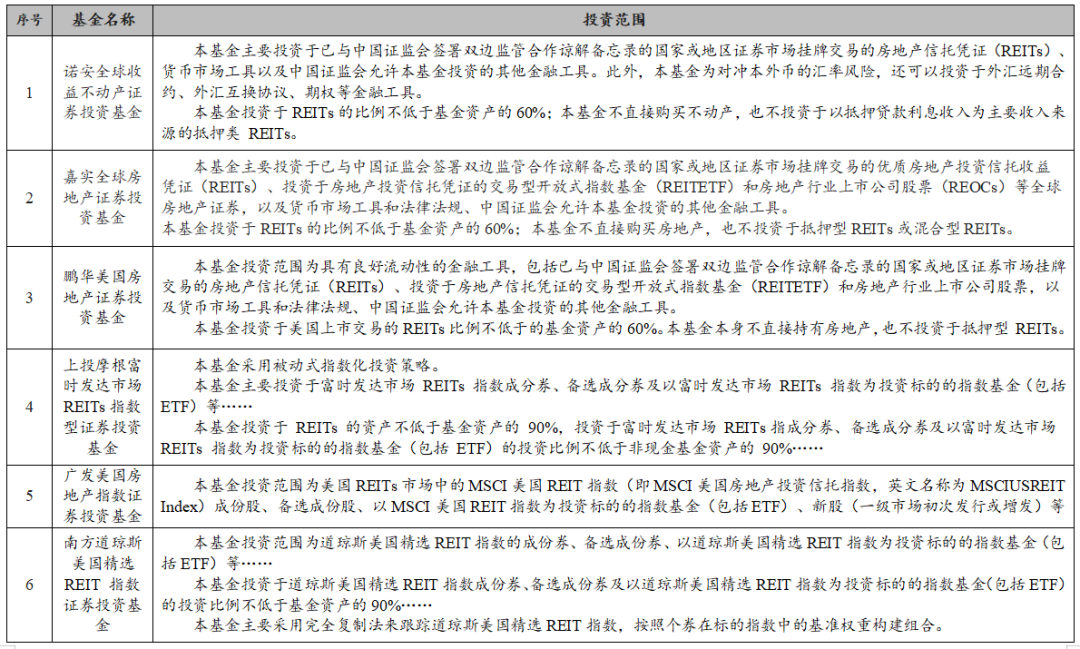 由于國內目前并沒有真正意義上的REITs,投資者主要通過借道QDII基金投資的海外REITs。據小編查詢,國內市場投資REITs的公募基金共6只,均為QDII基金(其中3只為被動式指數基金)。境外REITs和境內基礎設施REITs本質相同,通過QDII基金的資產配置策略可以了解REITs基礎資產的研判要點,亦可以作為承做端的重要參考。