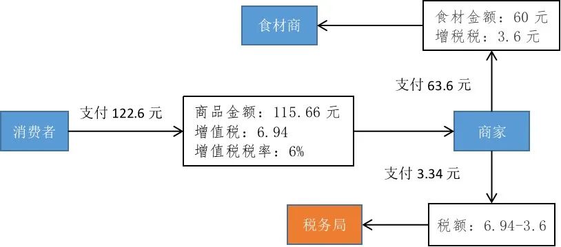 以日常生活中的餐飲為例,在消費結(jié)束后開具增值稅發(fā)票,發(fā)票金額中經(jīng)常會出現(xiàn)三個金額,如下圖所示,作為消費者最終要支付的金額為122.6元。但通過發(fā)票可以看出,其組成結(jié)構(gòu)為兩部分:即115.66元+6.94元。115.6元是餐飲服務實際發(fā)生的金額;6.94元是伴隨這項消費產(chǎn)生的增值稅。