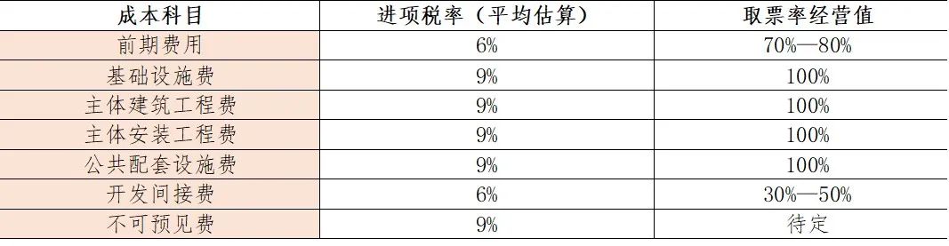 根據(jù)當前政策,銷項稅率按照9%計算,土地成本虛擬進項稅率也為9%計算,成本及費用的進項稅率有6%、9%及13%等,但需注意各項成本的取票率,根據(jù)各項成本費用占比計算綜合取票率數(shù)值。