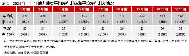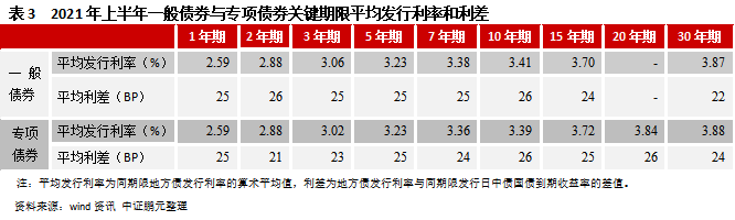 1、上半年發行利率整體有所下行。2021年上半年地方債發行利率在2.59%到3.98%之間,平均發行利率為3.48%,較2020年下半年3.59%的平均發行利率下行超過11BP,主要是受地方債期限縮短因素的影響。具體來看,3年期為3.04%,下行5BP;5年期為3.23%,上行5BP;7年期為3.37%,下行1BP;10年期為3.4%,上行6BP;15年期為3.72%,下行5BP;20年期為3.84%,下行6BP;30年期為3.88%,下行16BP。