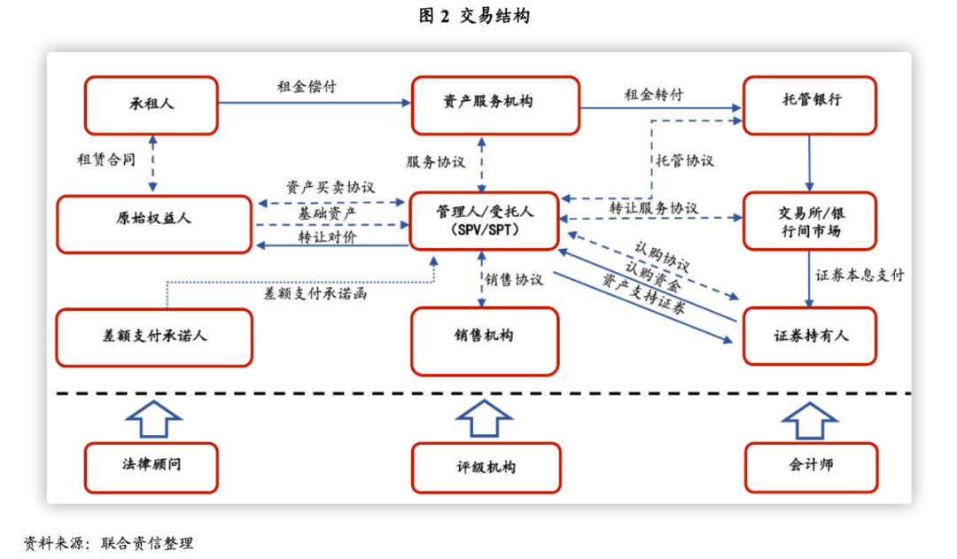 在常見(jiàn)的融資租賃資產(chǎn)支持證券的交易結(jié)構(gòu)中,一般由管理人/受托人設(shè)立特殊目的載體(SPV/SPT),管理人/受托人收到募集資金后,用于向原始權(quán)益人購(gòu)買(mǎi)租賃債權(quán)資產(chǎn),再以租賃債權(quán)資產(chǎn)形成的本息收益按交易結(jié)構(gòu)的約定向資產(chǎn)支持證券持有人還本付息。融資租賃債權(quán)資產(chǎn)支持證券一般交易結(jié)構(gòu)如上圖所示。一般而言,原始權(quán)益人會(huì)繼續(xù)承擔(dān)資產(chǎn)服務(wù)機(jī)構(gòu)的角色,對(duì)屬于SPV/SPT的基礎(chǔ)資產(chǎn)現(xiàn)金流回款進(jìn)行歸集、轉(zhuǎn)付、催收以及違約基礎(chǔ)資產(chǎn)租賃物的處置。