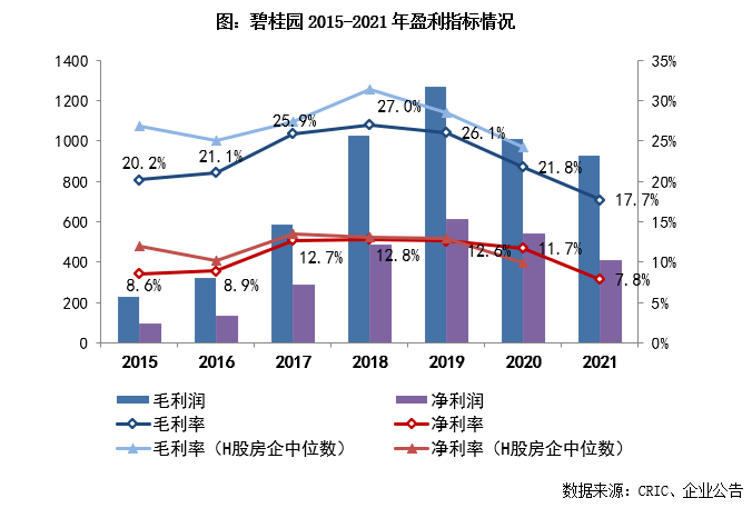2021年,碧桂園實(shí)現(xiàn)營業(yè)收入5230.6億元,同比增長13%;毛利潤927.8億元、凈利潤409.8億元;歸母凈利潤268億元、核心凈利潤269.3億元。毛利規(guī)模的下降主要是受到2017、2018年部分高成本獲取的低毛利項(xiàng)目進(jìn)入交付和2021下半年市場下行行業(yè)降價(jià)促銷影響,對結(jié)算利潤率水平有一定影響。2021年,碧桂園實(shí)現(xiàn)毛利率17.7%、凈利率7.8%、核心凈利率5.1%,較去年同期均有不同程度的降低。管理層預(yù)計(jì),目前短期內(nèi)還處于市場出清的過程中,中長期毛利率水平有改善空間。