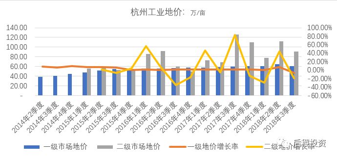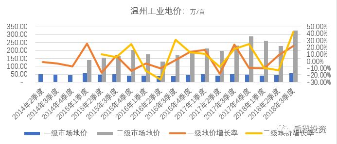 我們挑選杭州、寧波、溫州這三個比較典型城市,統(tǒng)計了自2014-2018年工業(yè)土地司法拍賣與一級出讓的價格變化趨勢: