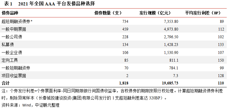 從發債品種的選擇,超短期融資債券是全國AAA平臺最主要的發債品種,發行支數和發行規模顯著高于其他債券品種;其次是一般中期票據和一般公司債;再次為私募債和一般企業債,整體發行數和發行規模一般,定向工具和一般短期融資券發行量較少,項目收益票據極少。從利差看,因短期融資券的發行期限短導致整體發行利差低,而私募債和定向工具受資金需求及投資者偏好等影響整體利差偏高。