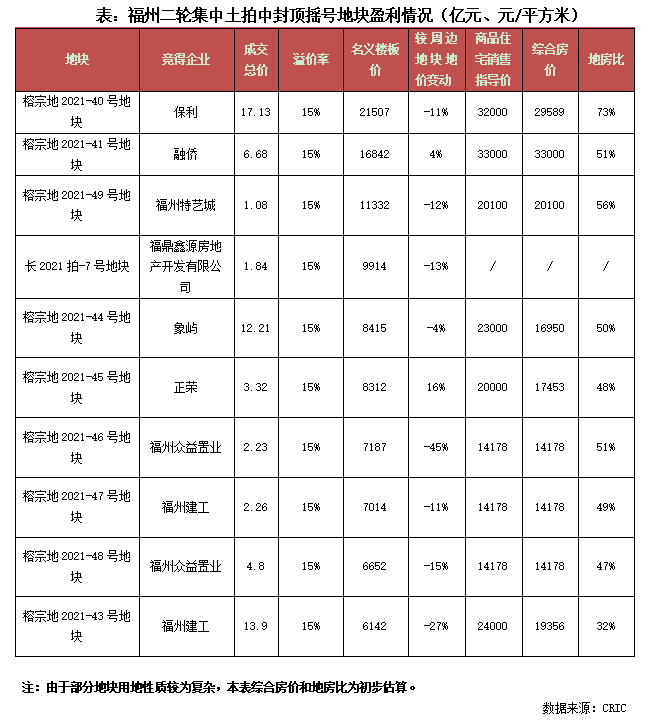 而晉安區(qū)紅光村地塊由于區(qū)位優(yōu)越,吸引了10余家房企參拍,一開拍就觸及最高限價進入搖號環(huán)節(jié),最終被保利以17.13億+搖號競得,平均樓板價高達21507元/平方米,也是本場拍中樓板價最貴的地塊。該地塊要配建2萬平方米人才限價商品房(價格為商品住宅備案價格的70%),按照商品住宅銷售指導價為32000元/平方米綜合測算的話,地房比為73%,房地差超8000元/平方米,尚有一定的盈利空間。