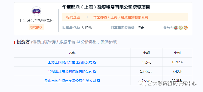 其中,華寶都鼎(上海)融資租賃有限公司在2021年2月10日,上海聯(lián)合產(chǎn)交所正式掛牌后,目前已成交,受到3家戰(zhàn)略投資方青睞,分別是上海上國投資產(chǎn)管理有限公司成交額3億元,占股10.92%,馬鞍山江東金融控股有限公司成交額1.7億元,占股7.43%,舟山市國有資產(chǎn)投資經(jīng)營有限公司成交額3億元,占股22.23%。最終誰將成為華寶都鼎租賃的戰(zhàn)投,我們一起來期待。