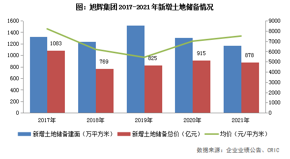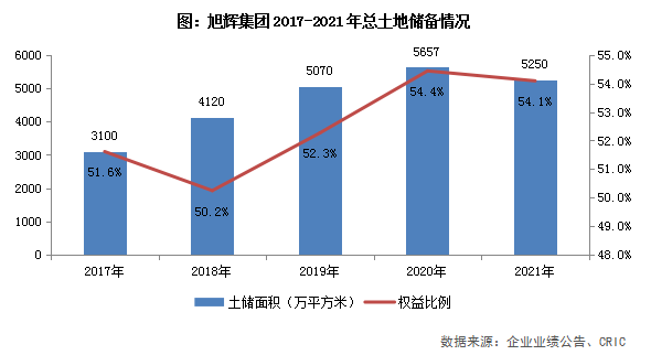 截至2021年底,旭輝共有土地儲備5250萬平方米(權益占比54.1%),自2017年以來首次出現總土儲規模下滑。從旭輝最近幾年的增長來看,企業目前的貨值儲備仍可以滿足3年左右的開發,較為充足。根據旭輝的“三五戰略”,企業將會推進“輕土儲”戰略,未來總土儲規模將會控制在2年的開發周期內,因此有可能短期內總土儲規模將會繼續保持當前水平甚至下降。