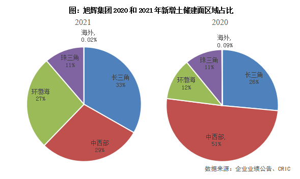 2021年旭輝的新增土儲建面的區域分布變化相對較大,企業在中西部的拿地占比大幅降低了22個百分點,而環渤海和長三角的拿地占比則分別提高了15和7個百分點。整體來看,2021年旭輝的新增土儲在各區域的分布更加均衡,有助于企業分散市場風險,讓企業的銷售能更加穩定地增長。