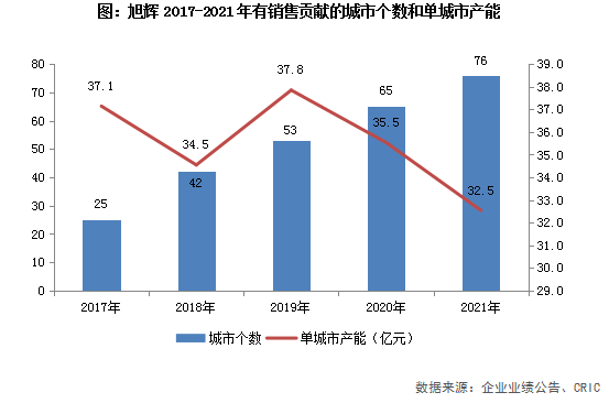 近年來旭輝的銷售規模持續保持較為穩定的增長,主要原因是旭輝持續開拓新的市場,有銷售貢獻的城市保持著較快的增長速度,據統計,2021年旭輝在76個城市有銷售貢獻,在2020年的基礎上繼續增加了11個。但是與此同時,旭輝2021年的平均單城市產能相較于2020年繼續有所下降,從35.5億元降至32.5億元,創下了自2017年以來的新低,可能是因為新進入城市較多從而拉低了平均產能。