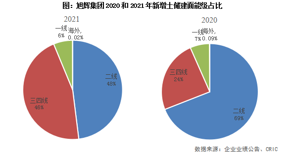 2021年旭輝銷售區域分布變化不大,長三角、環渤海、中西部以及華南區域的金額貢獻分別為46.7%、19.8%、22.4% 及11.2%,2020年則是43.8%、22.9%、22.2%以及11.1%。不過企業銷售的能級分布變化相對較大,一線城市的銷售占比從2020年的12.3%略微提升至13%,二線城市的銷售額占比大幅提升了13.8個百分點至74.2%,三四線城市的銷售額占比則從27.3%大幅降至12.8%。城市能級的變化使得旭輝在2021年的銷售均價相較于2020年有大幅提升,也是企業銷售回款率提升的保障。