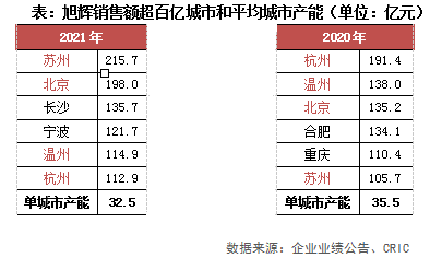 2021年旭輝銷售貢獻超百億的城市和2020年一樣是6個,其中對銷售額貢獻最高的城市是蘇州,全年的銷售額達到了215.7億元,同比增長了104%。值得注意的是,2021年旭輝銷售額過百億的城市中有4個和2020年相同,分別是蘇州、北京、溫州以及杭州,企業在這些城市的深耕已經有了不錯的效果;同時,旭輝在20個城市的銷售規模進入了當地的前十。從旭輝2022年計劃重點在15個城市拿地來看,企業仍在繼續加強重點城市的深耕力度,未來可能會提高單城市產能。