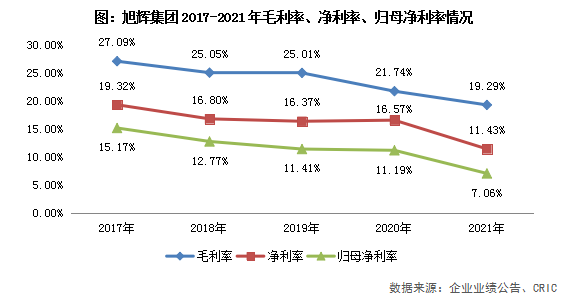 2021年旭輝實現營業收入1078億元,同比增加了50.2%,其中物業銷售收入為1027億元,占比達95.2%。企業的毛利潤同比增加了33.2%至208億元,毛利率則同比降低了2.45個百分點至19.29%,主要是受到了行業下行以及一二線城市限價政策的影響。