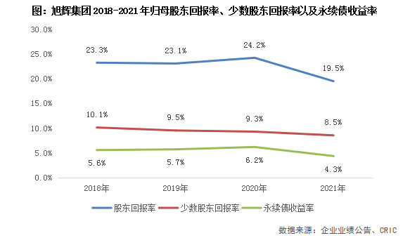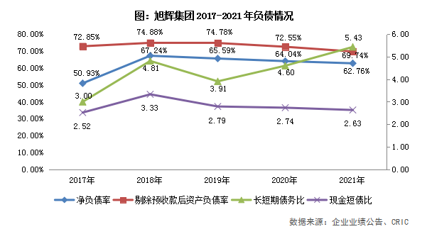 2021年底旭輝的持有現金約為467.1億元,較于期初減少了8.7%;總有息負債為1141.12億元,同比增加9%;企業的權益規模則增加了28.4%至1074億元,因此企業的凈負債率繼續降低了1.28個百分點至62.76%,若是將永續債作為負債計算,則旭輝的凈負債率為65.73%,同比降低了5.55個百分點,企業的凈負債率繼續保持在行業相對較低的水平。