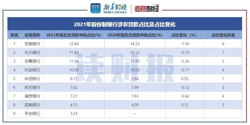 從變動情況來看,除平安銀行未披露2020年數據外,股份制銀行的占比普遍呈微降態勢,其中浙商銀行降幅最大,該行2021年涉農貸款占比較2020年下降1.5個百分點。
