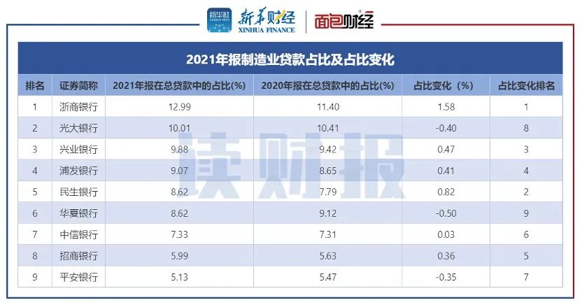 從增速來看,浙商銀行的制造業貸款增長較快,較2020年末相比增長28.11%;其次是招商銀行和興業銀行,較2020年末分別增長17.75%和17. 18%。而華夏銀行是股份制銀行中唯一一家制造業貸款下降的銀行。數據顯示,該行2021年制造業貸款較上年末下降0.79個百分點。
