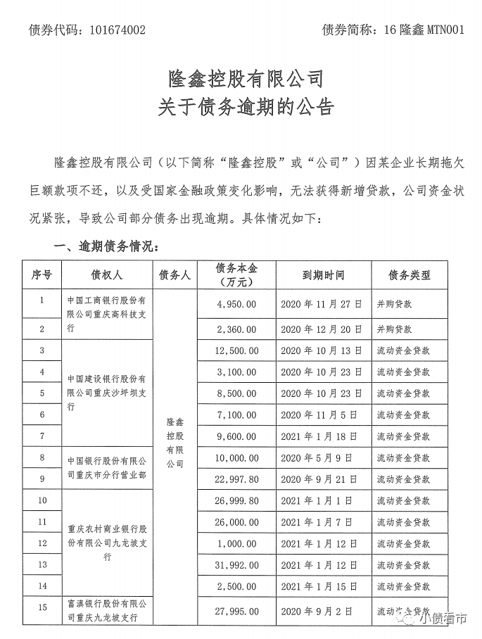 公告顯示,隆鑫控股逾期債務(wù)多達32筆,涉及工行、中行等十余家金融機構(gòu),債務(wù)多數(shù)已于去年到期。