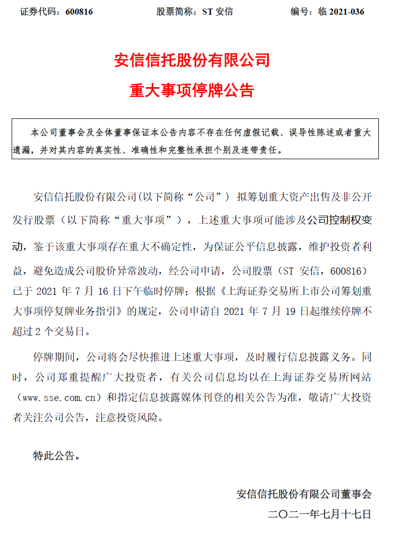 就在今天晚間的時候,ST安信發(fā)布公告稱:公司擬籌劃重大資產(chǎn)出售及非公開發(fā)行股票,該重大事項可能涉及公司控制權(quán)變動,鑒于該重大事項存在重大不確定性,為保證公平信息披露,維護投資者利益,避免造成公司股價異常波動,經(jīng)公司申請,公司股票已于2021年7月16日下午臨時停牌;公司申請自2021年7月19日起繼續(xù)停牌不超過2個交易日。