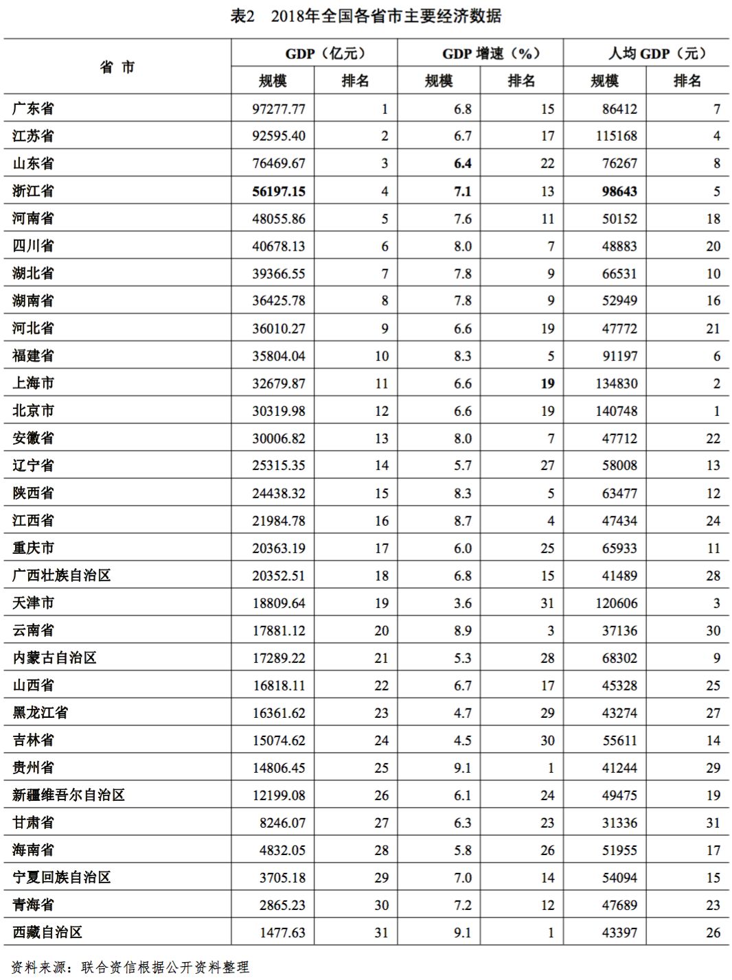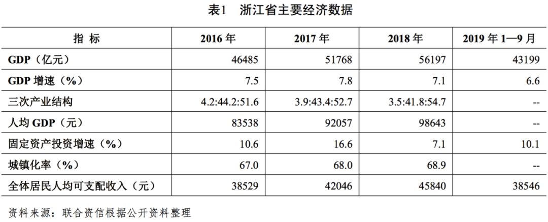 浙江省地處東南沿海,經(jīng)濟(jì)發(fā)展處于全國領(lǐng)先水平,GDP及增速連續(xù)多年位居全國第四位;產(chǎn)業(yè)結(jié)構(gòu)以第三產(chǎn)業(yè)為主,民營經(jīng)濟(jì)活躍度較高,固定資產(chǎn)投資增速2018年有所放緩,居民可支配收入及城鎮(zhèn)化率均處于全國較高水平。